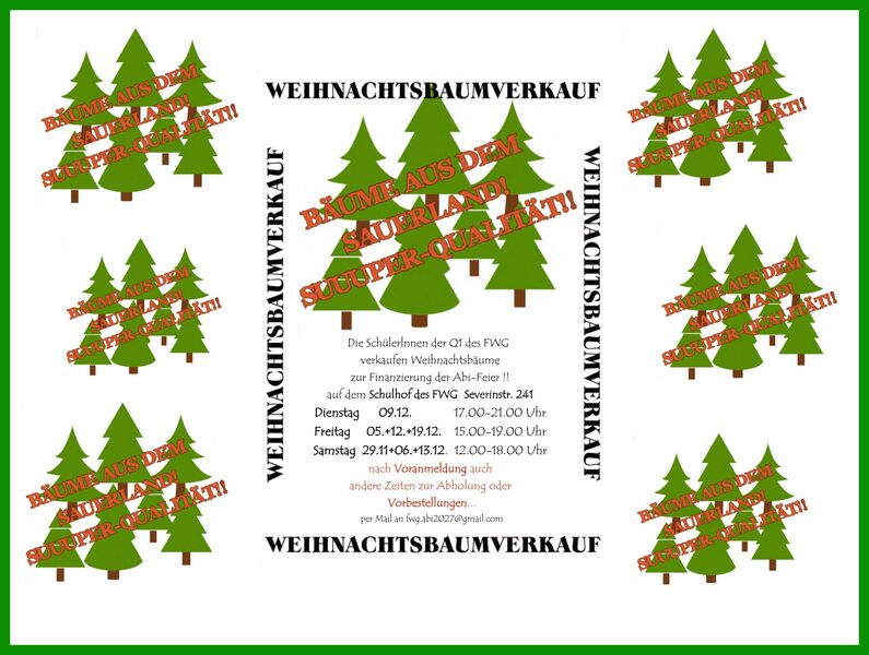 Wir, die Schüler/-innen der Q1, veranstalten im Dezember wieder den schon traditionellen Weihnachtsbaumverkauf am FWG, um Geld für die Finanzierung unseres Abiballs 2025 zu verdienen.