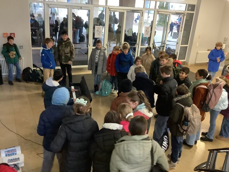 An allen Schultagen im Dezember erfüllen in der zweiten Pause weihnachtliche Klänge unsere Schule: Im oberen Foyer treffen wir uns, um gemeinsam Weihnachtslieder zu singen.